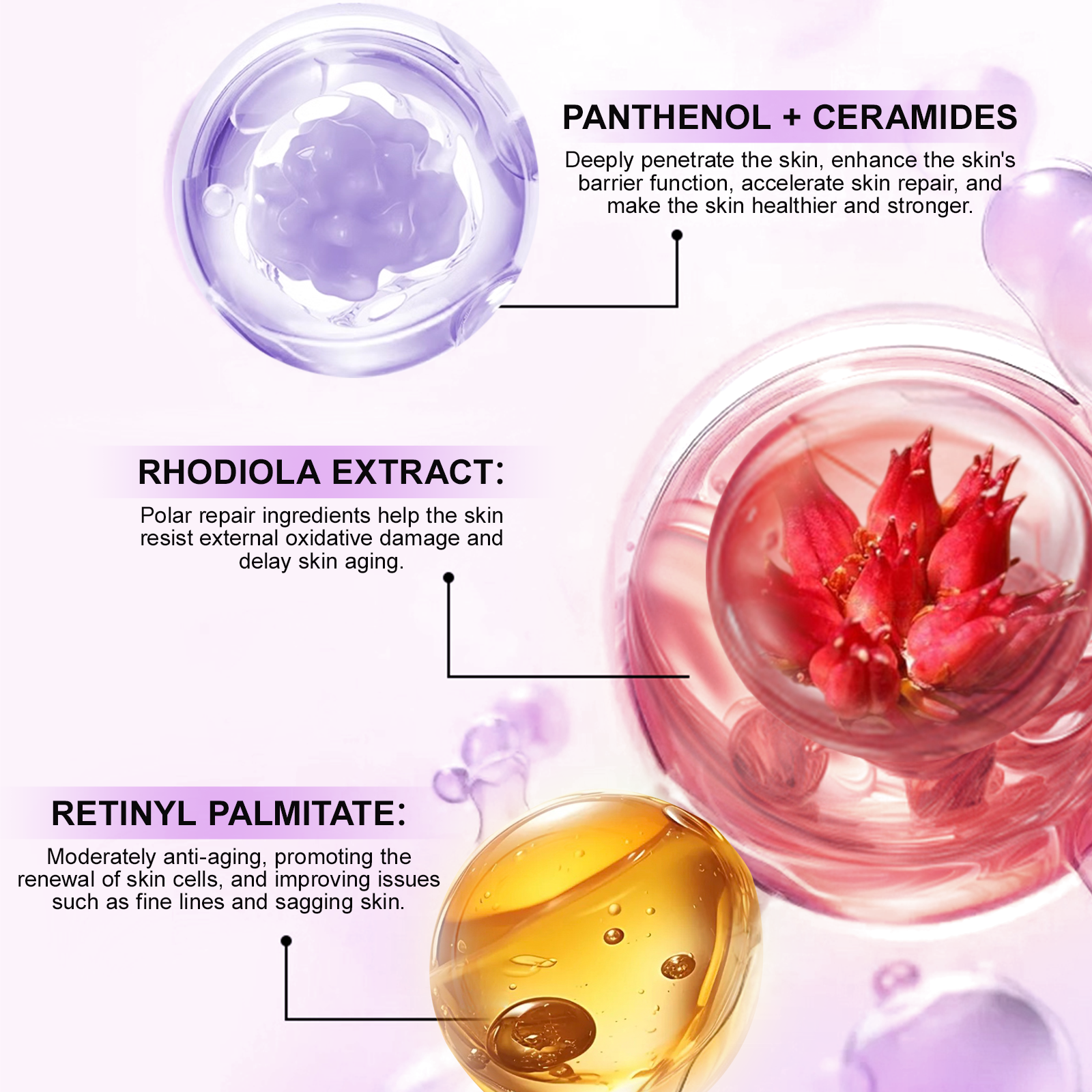 Anti-Aging and Rejuvenation: Retinol palmitate, Rhodiola extract, etc. work together to promote skin cell renewal, making the skin appear younger.