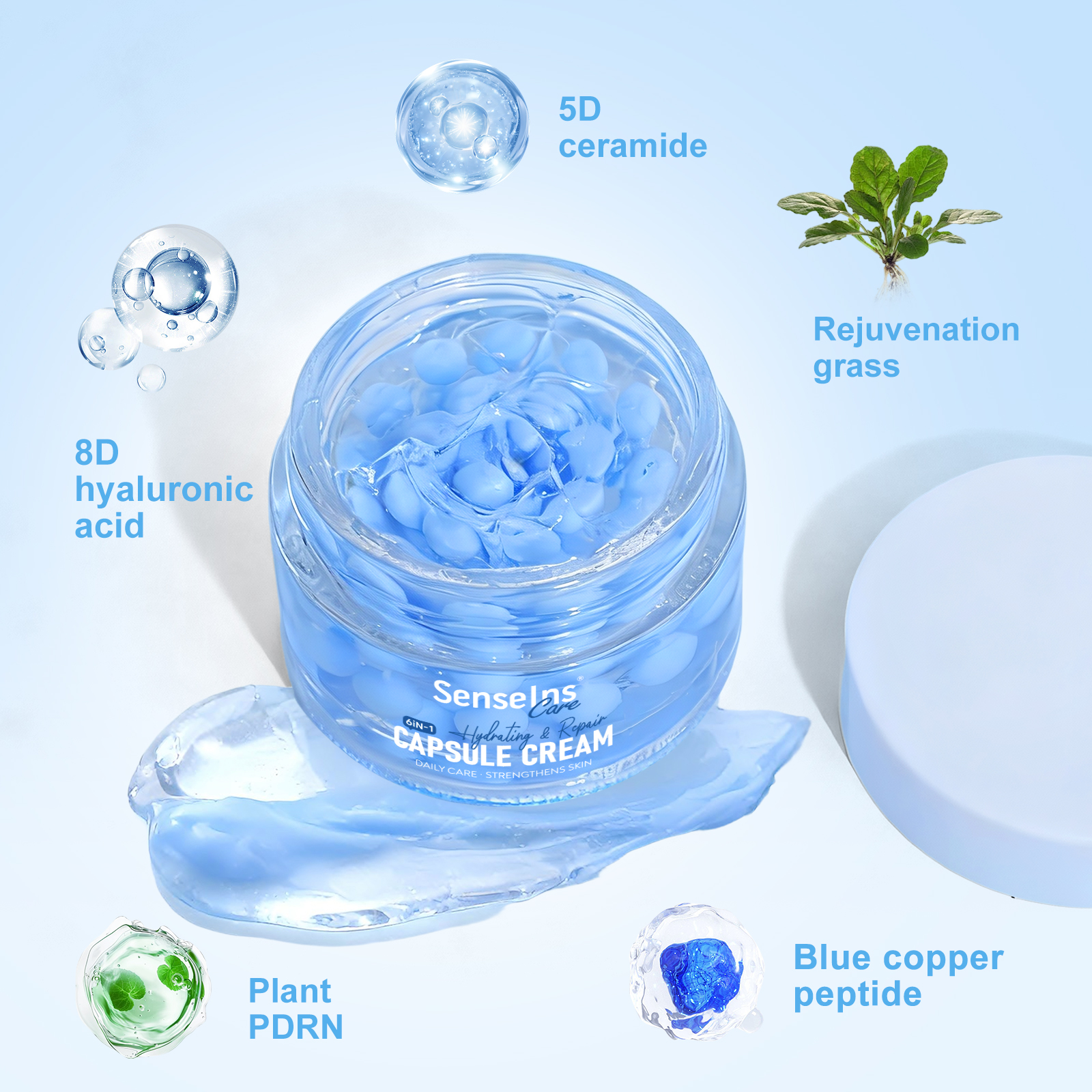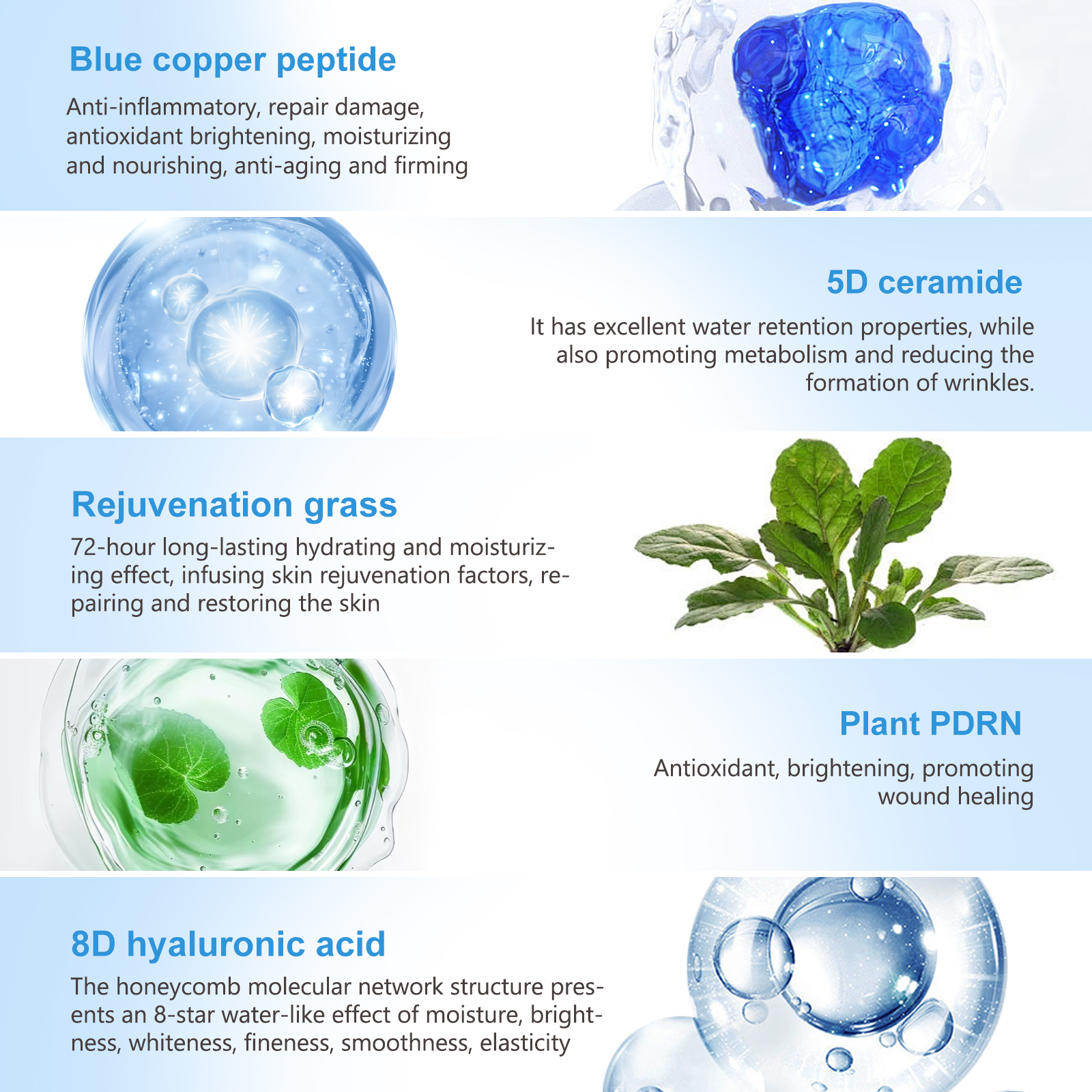 【Product Ingredients】Blue Copper Peptide, 5D Ceramide, Revived Grass, 8D Hyaluronic Acid, White Willow Bark, α-Betulinic Acid, + Plant PDRN