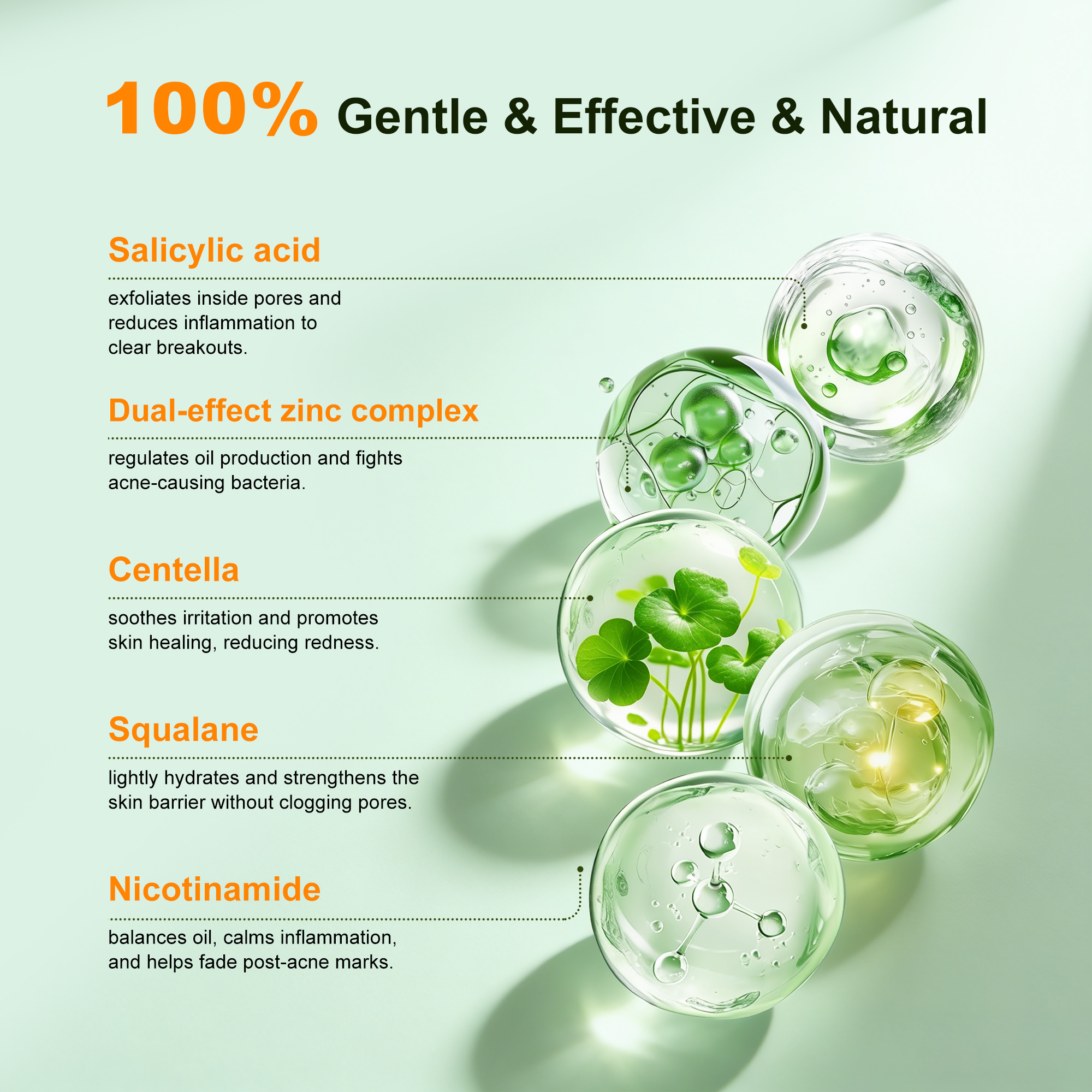 Dual-effect zinc complex regulates oil production and fights acne-causing bacteria.