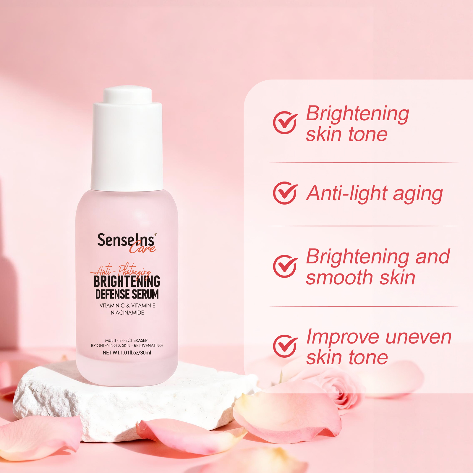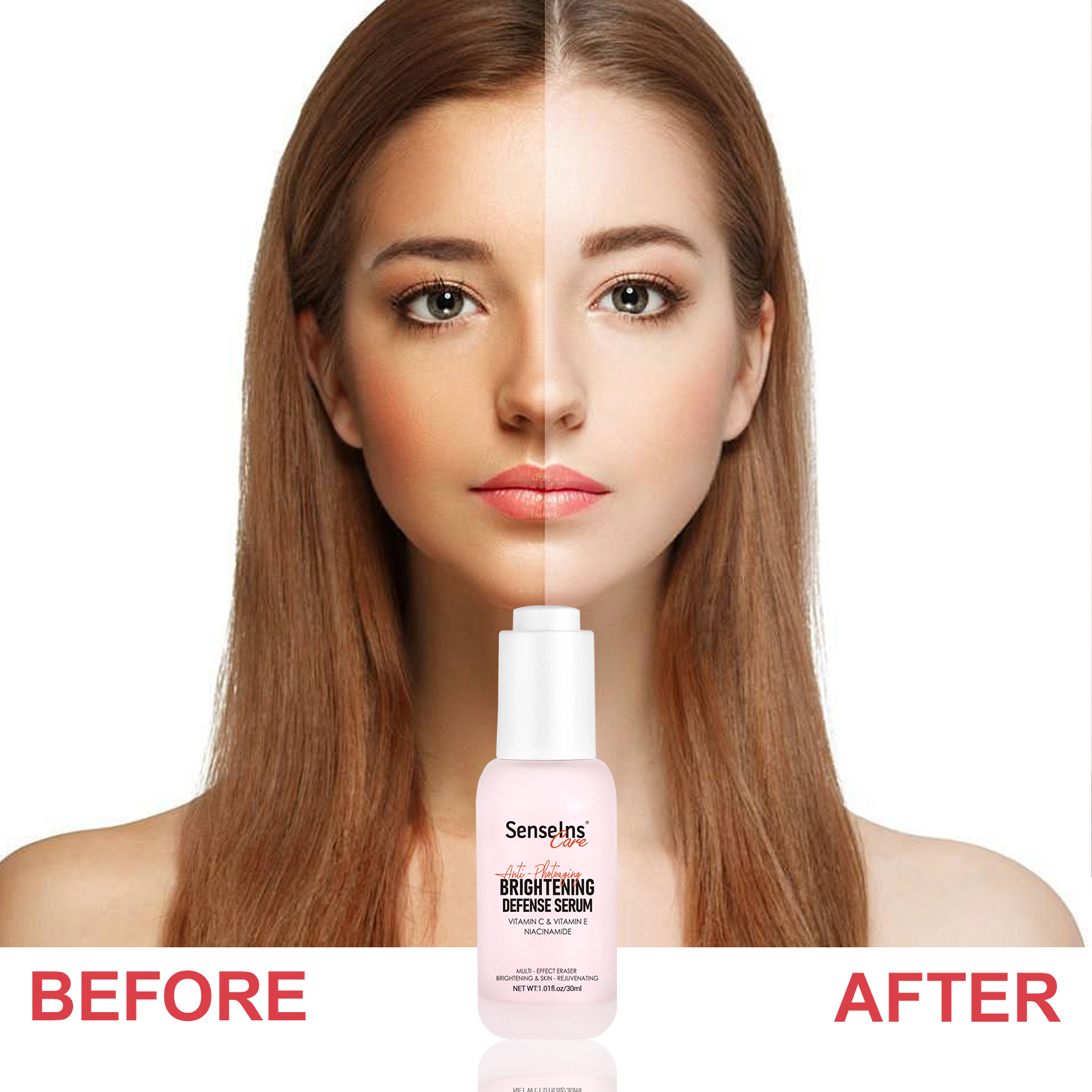 High-efficiency Multi-Functions: Contains vitamins C and E, etc. It combats photoaging from multiple aspects such as antioxidation, inhibition of melanin, and skin repair, achieving the effect of brightening and rejuvenating the skin.