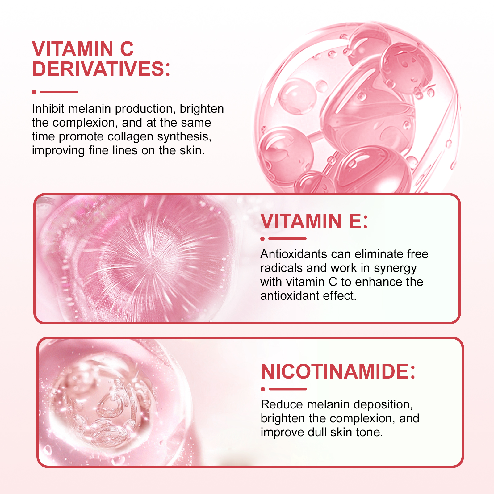 Vitamin C derivatives: Inhibit melanin production, brighten skin tone, and promote collagen synthesis, improving fine lines on the skin