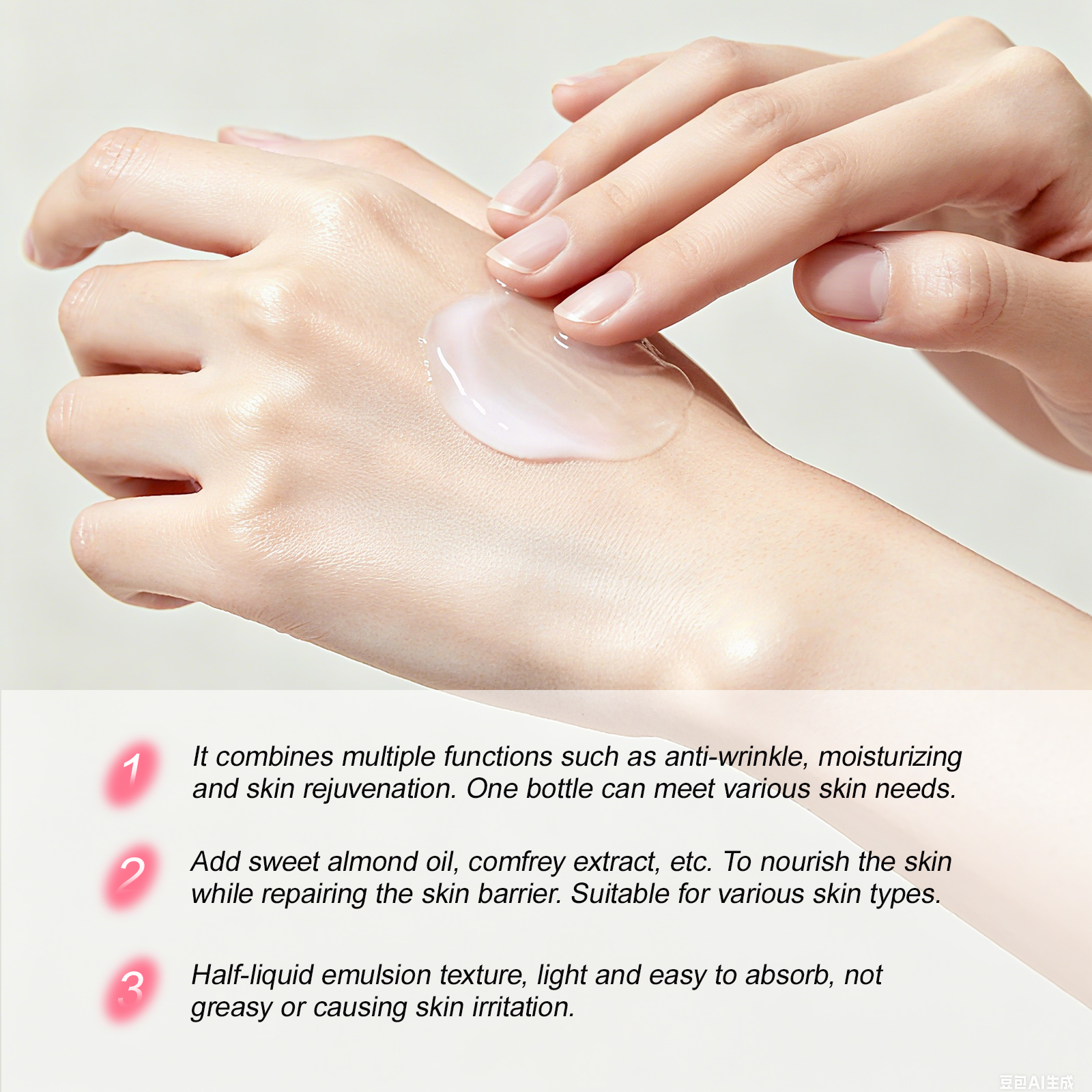 Comfortable Texture: Semi-permeable emulsion texture, light and easy to absorb, not greasy or causing skin congestion.