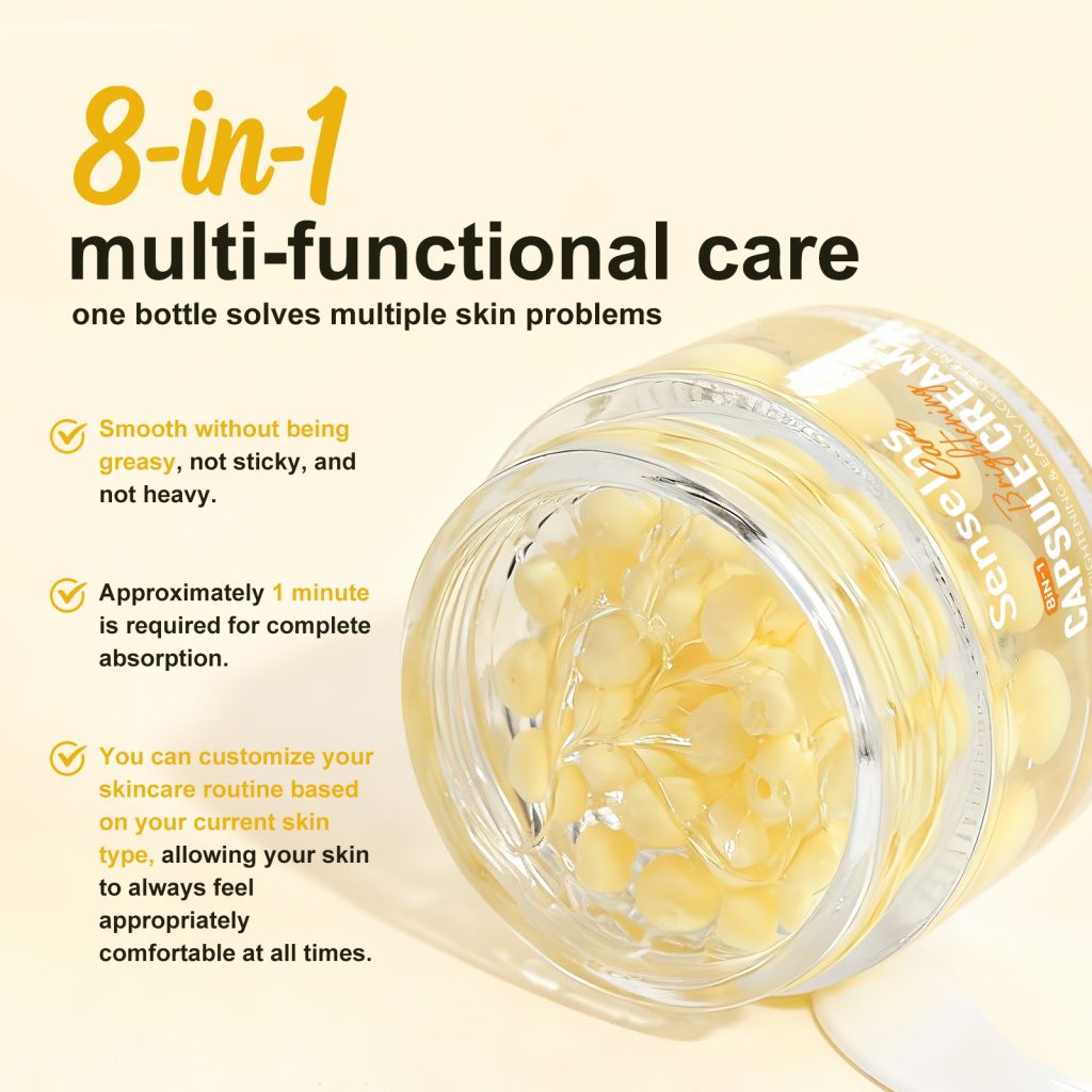 The beads in the Brightening Capsule Facial Cream are actually tiny capsules filled with ingredients like Vitamin C, Retinol, and plant extracts. These capsules are designed to break open only when you apply the cream, releasing their contents directly onto your skin. This means the ingredients are more effective because they are protected until the moment you use them.